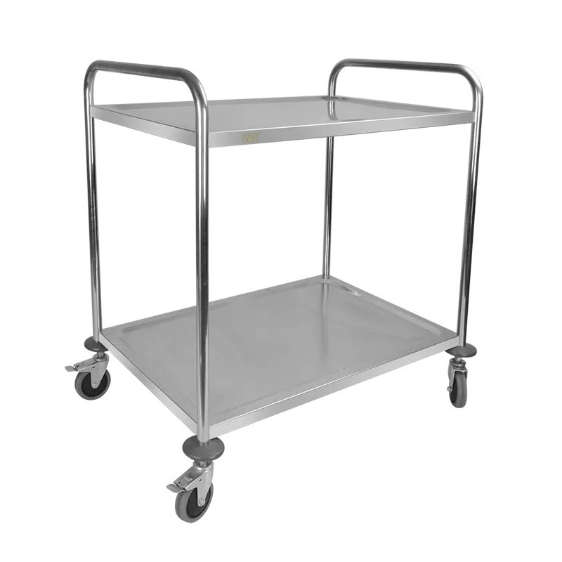 Agiliza el transporte y servicio en tu negocio con nuestro carro de acero inoxidable de 2 baldas, diseñado para durabilidad y movilidad.
