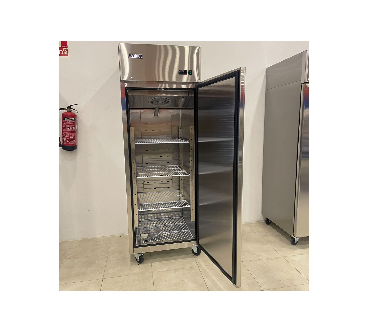 Frigorífico congelador vertical de una puerta de acero inoxidable para uso profesional.